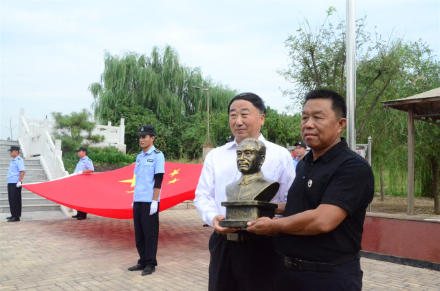 公司黨委書記、董事長王力民代表公司,接受紀(jì)念園負(fù)責(zé)人曹文濱代表紀(jì)念園捐贈的周恩來總理半身塑像。