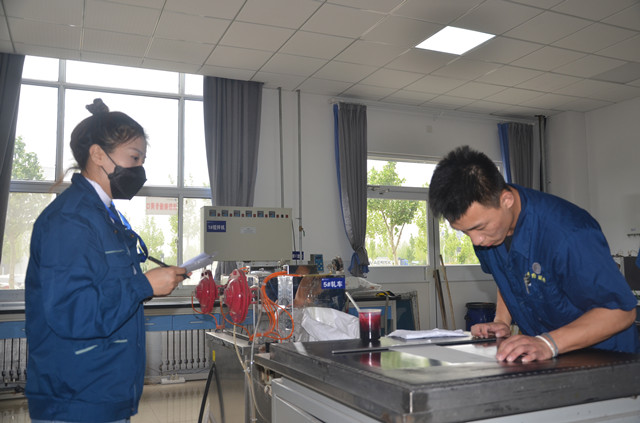 圖為4月26日公司對家紡車間化驗室新員工進行現(xiàn)場考評時的情形