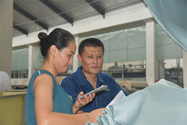 孫鎮(zhèn)身著工裝,每天巡回在車間前處理機(jī)臺之間,和暢的機(jī)聲成了他工作之時的伴奏。落實各機(jī)臺的計劃,組織各機(jī)臺生產(chǎn)跟進(jìn),管控本班的產(chǎn)品質(zhì)量,對操作規(guī)范進(jìn)行及時檢查、現(xiàn)場糾偏與指導(dǎo)培訓(xùn)。他一心撲在工作上,每天忙得不亦樂乎,目標(biāo)是帶領(lǐng)全班19名成員保質(zhì)保量地完成車間下達(dá)的任務(wù)目標(biāo)。他說,“做好生產(chǎn)工作有兩件法寶:一個是責(zé)任感,一個就是精益生產(chǎn)意識。”在孫鎮(zhèn)的心目中,作為公司的管理主線,精益生產(chǎn)需要全體“華紡人”共同傾心“打磨”,在時間里“磨”出真功夫來,干工作沒有捷徑,反復(fù)推敲,仔細(xì)琢磨;經(jīng)過工作實踐的摸爬滾打,才能提升自身本領(lǐng),才會使生產(chǎn)工作一步步精進(jìn)。