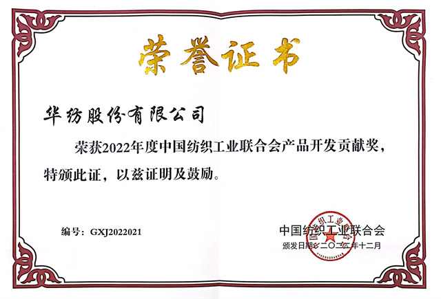導(dǎo)讀:近日,中國(guó)紡織工業(yè)聯(lián)合會(huì)發(fā)布《關(guān)于授予2022年度中國(guó)紡織工業(yè)聯(lián)合會(huì)產(chǎn)品開(kāi)發(fā)貢獻(xiàn)獎(jiǎng)等榮譽(yù)稱(chēng)號(hào)的決定》,公司獲評(píng)“2022年度中國(guó)紡織工業(yè)聯(lián)合會(huì)產(chǎn)品開(kāi)發(fā)貢獻(xiàn)獎(jiǎng)”榮譽(yù)稱(chēng)號(hào)。