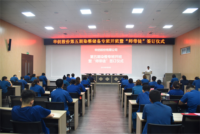 導讀:8月9日,公司舉行第五期染整技術儲備人才專班開班暨“師帶徒”簽訂儀式。