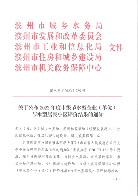 近日,濱州市城鄉(xiāng)水務(wù)局、濱州市發(fā)展和改革委員會、濱州市工業(yè)和信息化局、濱州市住房和城鄉(xiāng)建設(shè)局、濱州市機(jī)關(guān)政務(wù)保障中心發(fā)布了《關(guān)于公布2023年度市級節(jié)水型企業(yè)(單位)、節(jié)水型居民小區(qū)評價結(jié)果的通知》,經(jīng)綜合評價,公司達(dá)到市級節(jié)水型企業(yè)(單位 )、節(jié)水型居民小區(qū)標(biāo)準(zhǔn)要求,獲評2023年度濱州市節(jié)水型企業(yè)。