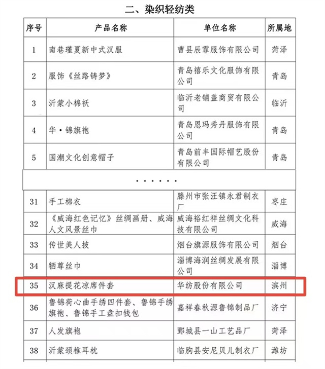 “山東手造”是省委、省政府發(fā)揮文化資源豐厚、傳統(tǒng)工藝品類齊全的優(yōu)勢,創(chuàng)新打造的文化創(chuàng)意區(qū)域公共品牌,是塑造山東文化創(chuàng)意產(chǎn)業(yè)發(fā)展新優(yōu)勢的重要抓手。按照省委、省政府關(guān)于推進“山東手造”工程的部署安排,本次“山東手造·優(yōu)選100”遴選活動共分為傳統(tǒng)美術(shù)類、染織輕紡類、文玩用品類、刻塑鑄造類、木作家具類、傳統(tǒng)食品類六大類。其中,公司家紡床品產(chǎn)品——漢麻提花涼席件套作為染織輕紡類,成功入選2023“山東手造·優(yōu)選100”名單,這無疑是對公司產(chǎn)品品質(zhì)與工藝的高度認可。