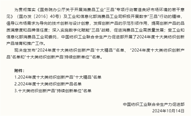 導讀:近日,中國紡織工業(yè)聯(lián)合會生產力促進部發(fā)布了“2024年度十大類紡織創(chuàng)新產品‘十大精品’”名單、“2024年度十大類紡織創(chuàng)新產品”名單和“十大類紡織創(chuàng)新產品‘持續(xù)創(chuàng)新單位’”名