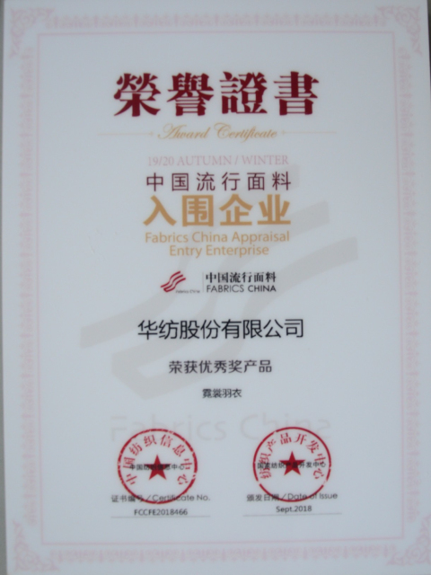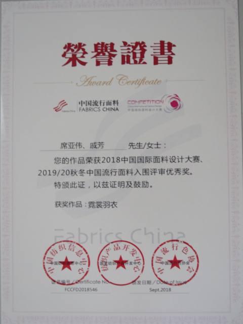 日前,公司在2018年中國國際面料設計大賽、第40屆(2019/20秋冬)中國流行面料入圍評審中再獲佳績,被授予“2019/20秋冬流行面料入圍企業(yè)”稱號,由席亞偉、戚芳設計的“霓裳羽衣”面料產(chǎn)品榮獲大賽優(yōu)秀獎。