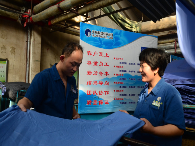 圖為面二車間甲班4#水洗機(jī)機(jī)長(zhǎng)劉學(xué)濤(左)在與出檢工張海燕查看下機(jī)產(chǎn)品的質(zhì)量情況。